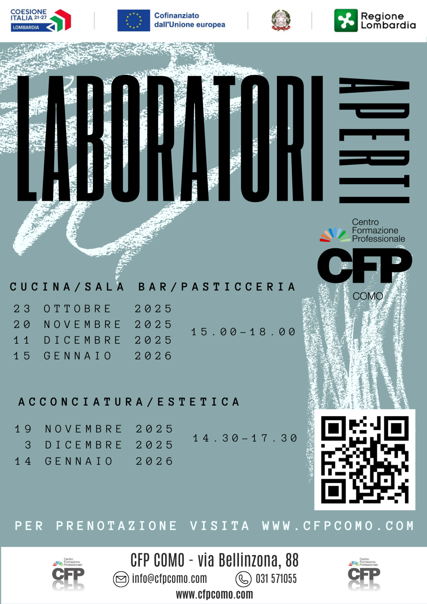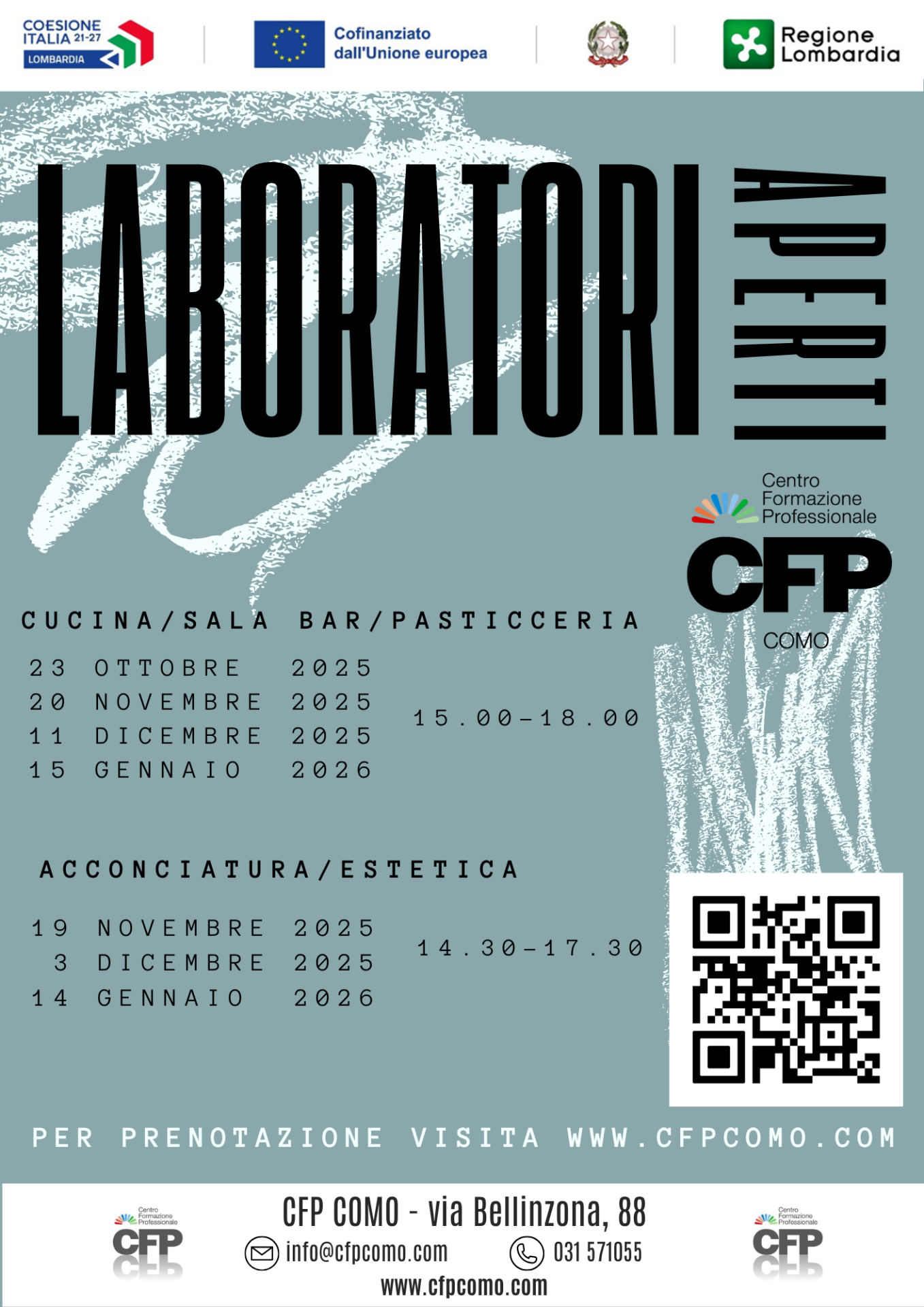 News & Eventi Briciole di pane Home News & Eventi News & Eventi Content type - Qualsiasi - Evento News 09/10/2025 OPEN DAY E INIZIATIVE DI ORIENTAMENTO Open DayIl CFP accoglierà alunni e famiglie delle Scuole Secondarie di Primo grado il 29 novembre e il 13 dicembre: momenti dedicati alla scoperta… 09/10/2025 OPEN DAY E INIZIATIVE DI ORIENTAMENTO Open DayIl CFP accoglierà alunni e famiglie delle Scuole Secondarie di Primo grado il 29 novembre e il 13 dicembre: momenti dedicati alla scoperta… 08/10/2025 OPEN DAY E ORIENTAMENTO 2024/25 Open DayIl CFP accoglierà alunni e famiglie delle Scuole Secondarie di Primo grado il 29 novembre e il 13 dicembre: momenti dedicati alla scoperta… 08/10/2025 OPEN DAY E ORIENTAMENTO 2024/25 Open DayIl CFP accoglierà alunni e famiglie delle Scuole Secondarie di Primo grado il 29 novembre e il 13 dicembre: momenti dedicati alla scoperta… 01/10/2025 OPEN DAY E LABORATORI DI ORIENTAMENTO 2025 Open DayIl CFP accoglierà alunni e famiglie delle Scuole Secondarie di Primo grado il 29 novembre e il 13 dicembre: momenti dedicati alla scoperta… 01/10/2025 OPEN DAY E LABORATORI DI ORIENTAMENTO 2025 Open DayIl CFP accoglierà alunni e famiglie delle Scuole Secondarie di Primo grado il 29 novembre e il 13 dicembre: momenti dedicati alla scoperta… 30/09/2025 CRITERI SELEZIONE destinatari dote 2025/2026 Si pubblicano in allegato i "Criteri di selezione dei destinatari dote" 2025/2026La Direzione 24/09/2025 COMUNICAZIONE Dote Scuola – Componente Merito, anno scolastico e formativo 2024/2025 COMUNICAZIONESi comunica che gli Allievi della Quarta Annualità diplomati a giugno 2025 possono accedere alla Dote Scuola – Componente Merito,… 22/09/2025 CHIUSURA DEL CENTRO FORMAZIONE PROFESSIONALE IN DATA 23 SETTEMBRE 2025 prot. 1719 CHIUSURA DEL CENTRO FORMAZIONE PROFESSIONALE IN DATA 23 SETTEMBRE 2025 SI COMUNICA CHE LA PREFETTURA DI COMO HA… 16/09/2025 ERASMUS+ QUARTI ANNI 2025/2026: PUBBLICAZIONE AVVISO DI PARTECIPAZIONE Si pubblica l'Avviso per la partecipazione alle mobilità Erasmus per tutti gli studenti delle quarte annualità. La domanda di … 30/07/2025 AVVIO ANNO FORMATIVO 2025/2026 Si pubblicano, in allegato, le indicazioni relative all’avvio dell’Anno Formativo 2025/2026.Cordiali salutiLa Direzione 17/07/2025 AVVISO ERASMUS+ DI LUNGO PERIODO DIPLOMATI A.F. 2025/2026: ELENCO DIPLOMATI AMMESSI Viene pubblicata in allegato la Graduatoria dei candidati AMMESSI per le mobilità di lungo periodo realizzabili grazie al … 02/07/2025 LIBRI DI TESTO 2025 / 2026 LIBRI DI TESTO 2025 / 2026Si pubblicano in allegato i testi per l'Anno Formativo 2025/2026. La Direzione 16/06/2025 AVVISO ERASMUS+ DI LUNGO PERIODO DIPLOMATI A.F. 2025/2026 Viene pubblicato l'avviso per la partecipazione alle mobilità di lungo periodo per l'anno formativo 2025/2026 rivolto a tutti i diplomati di quarto… 08/04/2025 DOTE SCUOLA 2025/2026 Dote Scuola - componente Materiale Didattico anno scolastico e formativo 2025/2026Da oggi è possibile presentare domanda per Dote Scuola, componente… 28/03/2025 CRITERI DI PRECEDENZA - IV ANNI Si pubblicano criteri di precedenza nell'ammissione ai corsi di IV annualità 2025-2026 nel caso di iscrizioni in esubero f.to La Direzione 31/01/2025 NUOVE OPPORTUNITA' PERCORSI SPERIMENTALI 2025/26 In allegato NUOVE OPPORTUNITÀ CON I PERCORSI SPERIMENTALI 4+2 - SALA BAR E CUCINA A.F. 2025/26.La Direzione 27/01/2025 GIORNATA DELLA MEMORIA Per non dimenticare... 07/01/2025 ISCRIZIONI ANNO SCOLASTICO 2025 - 2026 – POSTICIPO TERMINI Buongiorno Si avvisano tutte le famiglie e i tutori che è stata rideterminata la finestra temporale per la presentazione delle domande di… 28/11/2024 CRITERI DI PRECEDENZA ISCRIZIONI A.F. 2025 / 26 Buongiorno, Alleghiamo alla presente i “criteri di precedenza iscrizioni A.F. 2025/ 2026”. F.to Il Direttore F.to I… Load More