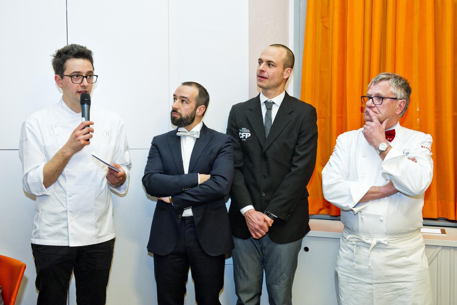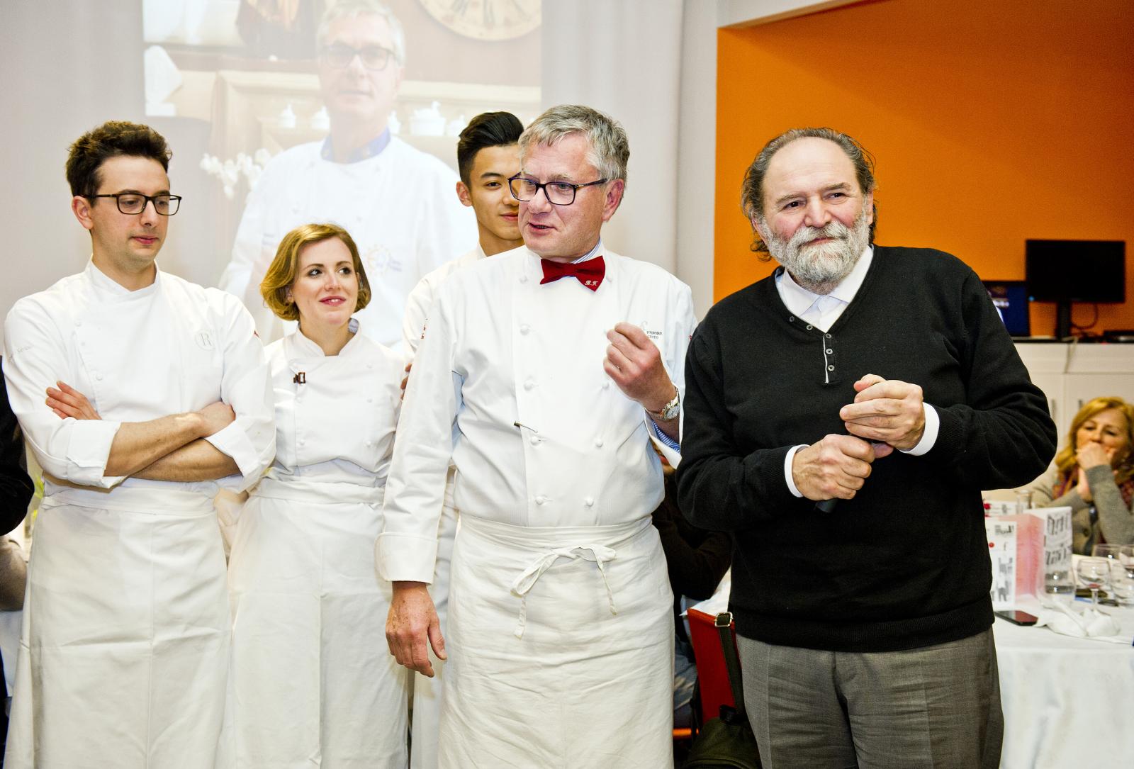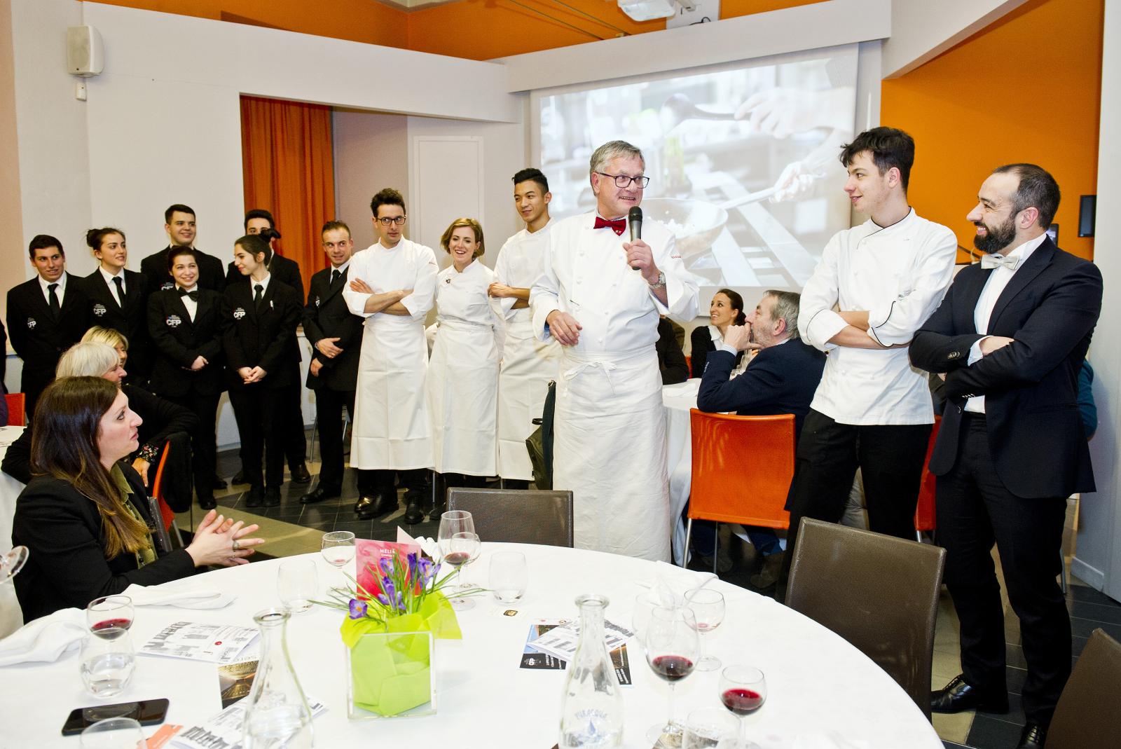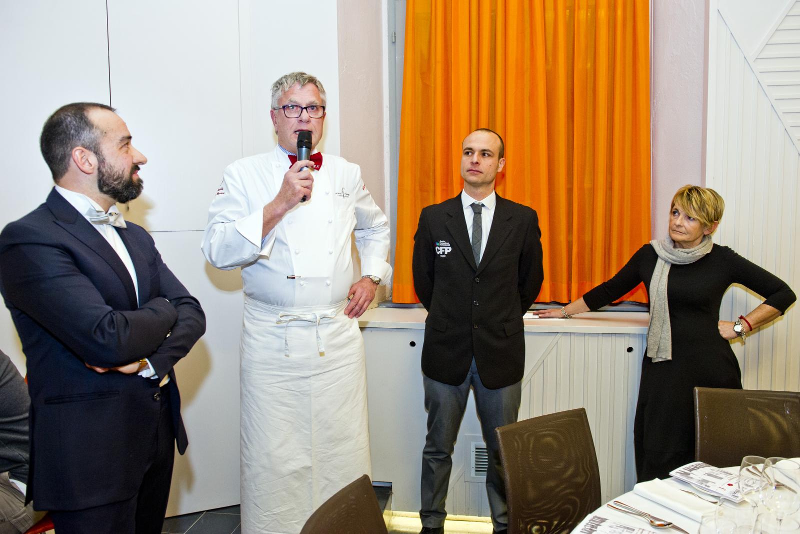 Photo Gallery Home Photo Gallery GRANDI CHEF AL CFP - BERNARD FOURNIER ed EDOARDO SAVINO (CENA A 4 MANI) GRANDI CHEF AL CFP - BERNARD FOURNIER ed EDOARDO SAVINO (CENA A 4 MANI) Importante appuntamento per le Serate dei grandi chef al Centro di Formazione Professionale della Provincia di Como. Lunedì 11 febbraio ospiti d’onore Bernard Fournier, chef patron dello stellato “Da Candida” di Campione d’Italia ed Edoardo Savino, executive chef del Ristorante "Conte Rossini - La Moderna Trattoria Italiana", nuovo ristorante dell’ Hotel Melià di Campione, la cui concezione è stata guidata proprio da Fournier in collaborazione con Luciano Tona, direttore del Bocuse d’Or Italia. La cucina di Tona ha preso spunto dalle collaborazioni con Gualtiero Marchesi per poi orientarsi verso uno stile polimorfico. Dopo essere stato Direttore di Alma, la celebre scuola internazionale di cucina italiana di Colorno, dal 2016 è direttore di Accademia Bocuse d’Or Italia, presieduta da Enrico Crippa, celebre ex allievo del CFP, chef del tre volte stellato Ristorante “Piazza duomo” di Alba. Bernard Fournier, francese di nascita e italiano per amore, con la moglie Adriana Berti ha gestito l’Orso Grigio a Trento, dove ha iniziato a diffondere la cultura e la conoscenza del Foie Gras. Nel 1992 ha acquisito il Ristorante Da Candida a Campione d’Italia che è stato il primo ad ottenere la stella Michelin in provincia di Como. Edoardo Savino è un giovane e talentuoso cuoco, Diplomato ad Alma nel 2017, che ha iniziato a collaborare con Fournier durante il suo tirocinio di formazione. Il sodalizio tra i tre illustri rappresentanti dell’alta cucina si ripropone per la serata al CFP che li vedrà interpreti di un menu molto ricercato. L'articolazione della serata ha visto un ricco e ricercato menu con alta qualità delle materie prime (tartufo nero, foglia d'oro e faraona su tutte), grande lavorazione dei piatti e servizio di alto livello. Protagonisti come sempre anche gli allievi del CFP: le quarte annualità dei corsi di cucina hanno avuto la grande opportunità di affiancare gli chef nella realizzazione dei piatti mentre gli studenti di sala si sono occupati del servizio e dell’accoglienza degli ospiti, con la guida del loro docente e dei professionisti del Ristorante “Da Candida”. Qui di seguito la Gallery dell'evento e la premiazione degli Chef da parte dello staff del CFP (Crediti fotografici Carlo Pozzoni) Torna indietro Condividi Su E-mailFacebookTwitterLinkedIn Gallery