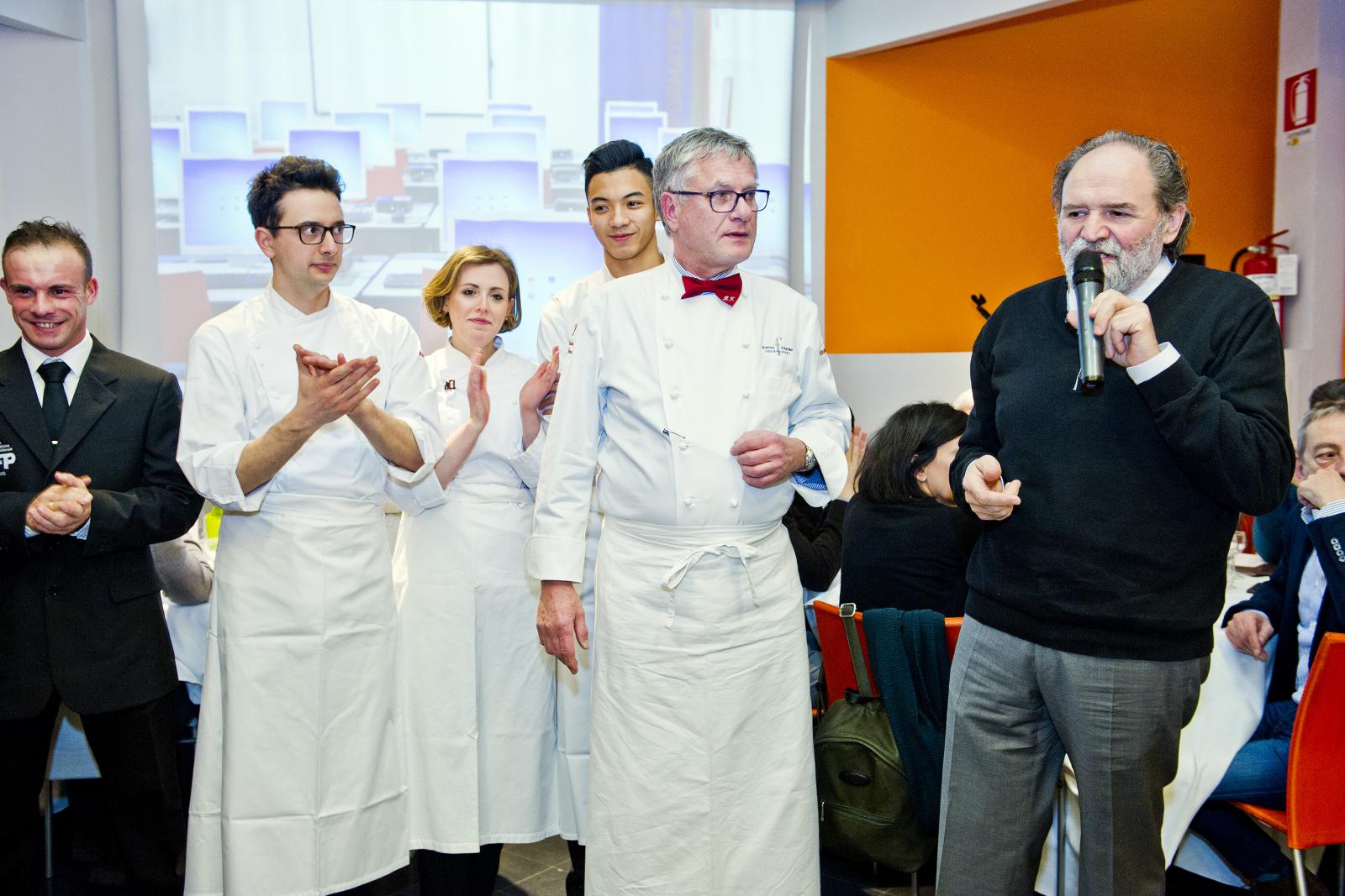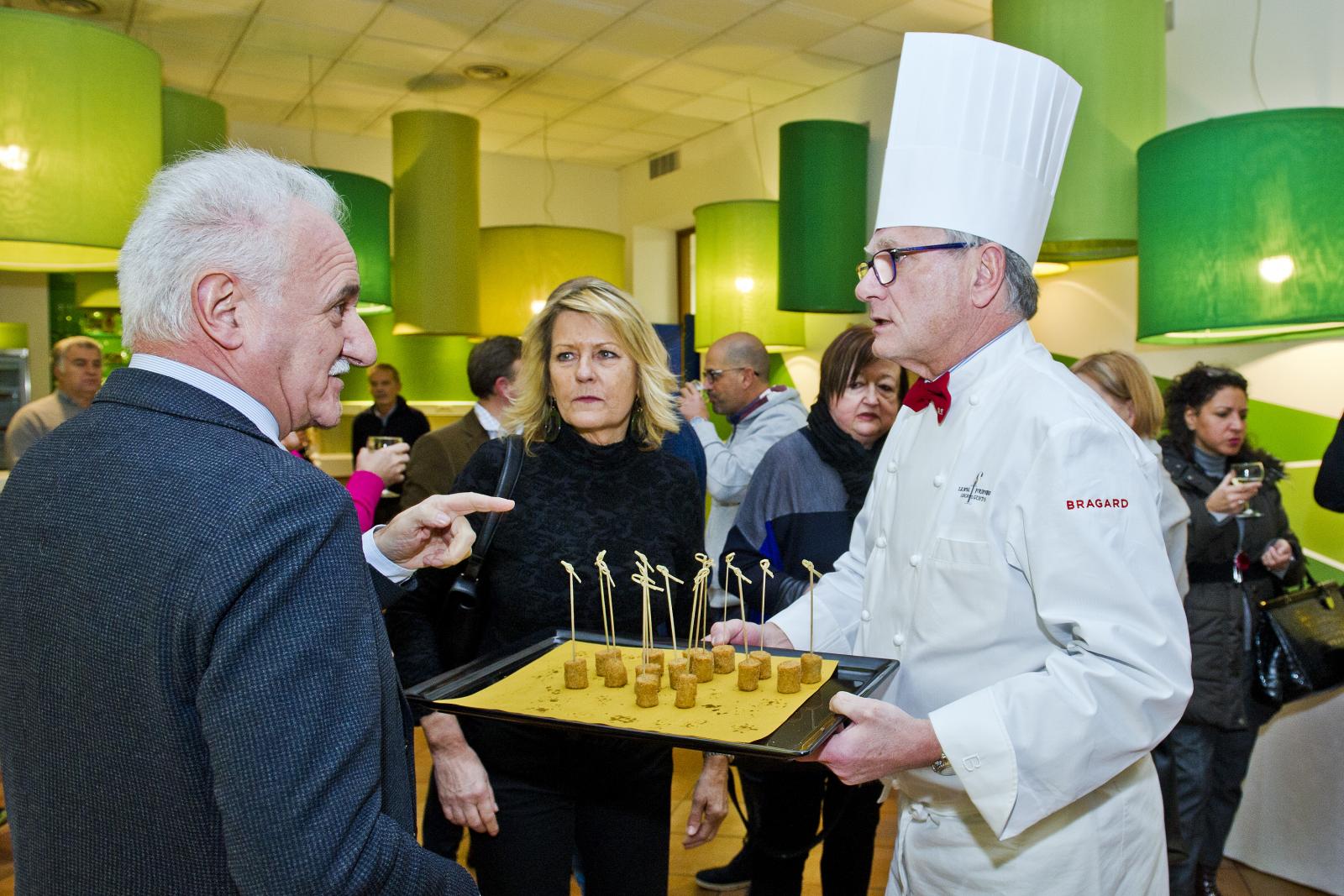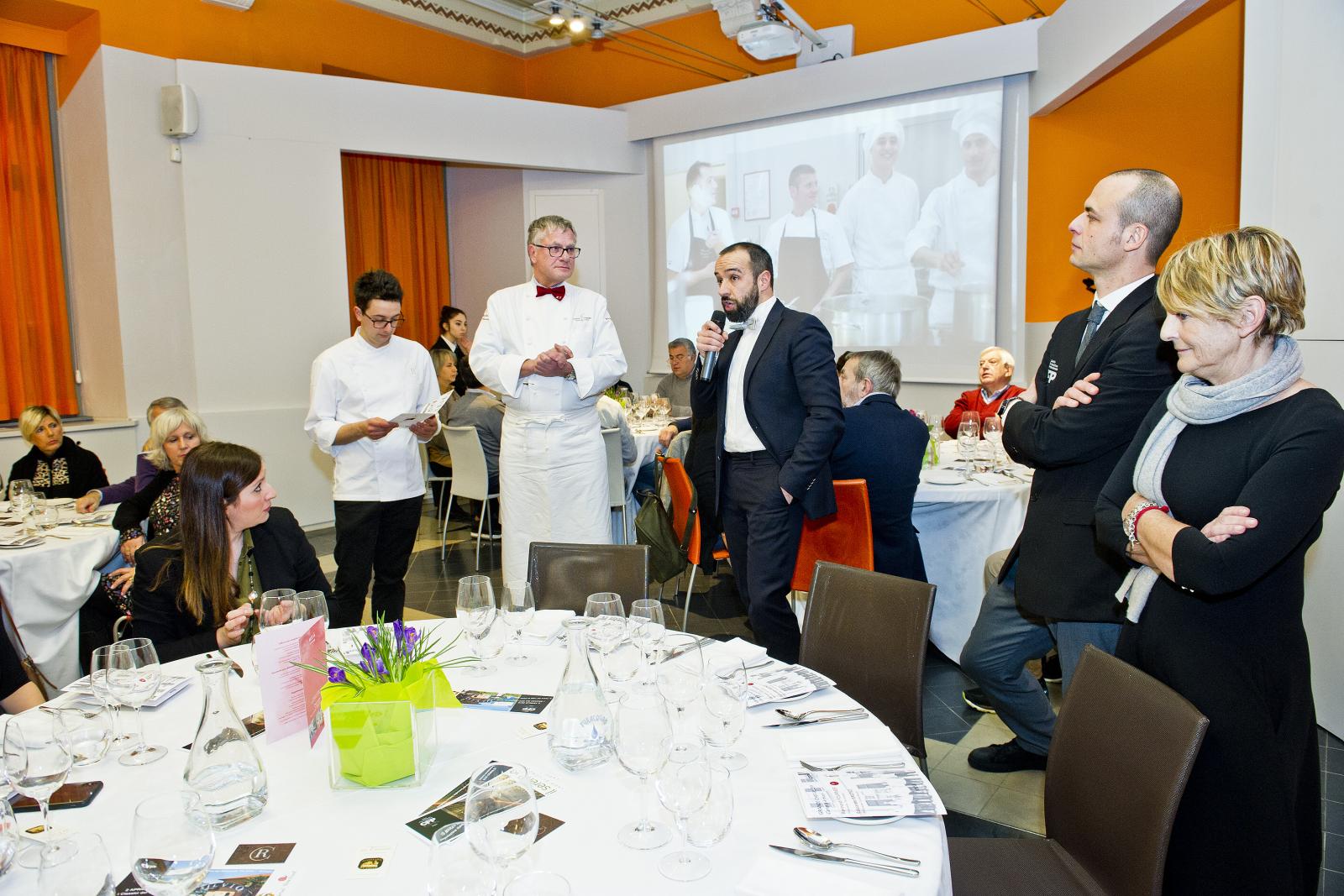 Photo Gallery Home Photo Gallery GRANDI CHEF AL CFP - BERNARD FOURNIER ed EDOARDO SAVINO (CENA A 4 MANI) GRANDI CHEF AL CFP - BERNARD FOURNIER ed EDOARDO SAVINO (CENA A 4 MANI) Importante appuntamento per le Serate dei grandi chef al Centro di Formazione Professionale della Provincia di Como. Lunedì 11 febbraio ospiti d’onore Bernard Fournier, chef patron dello stellato “Da Candida” di Campione d’Italia ed Edoardo Savino, executive chef del Ristorante "Conte Rossini - La Moderna Trattoria Italiana", nuovo ristorante dell’ Hotel Melià di Campione, la cui concezione è stata guidata proprio da Fournier in collaborazione con Luciano Tona, direttore del Bocuse d’Or Italia. La cucina di Tona ha preso spunto dalle collaborazioni con Gualtiero Marchesi per poi orientarsi verso uno stile polimorfico. Dopo essere stato Direttore di Alma, la celebre scuola internazionale di cucina italiana di Colorno, dal 2016 è direttore di Accademia Bocuse d’Or Italia, presieduta da Enrico Crippa, celebre ex allievo del CFP, chef del tre volte stellato Ristorante “Piazza duomo” di Alba. Bernard Fournier, francese di nascita e italiano per amore, con la moglie Adriana Berti ha gestito l’Orso Grigio a Trento, dove ha iniziato a diffondere la cultura e la conoscenza del Foie Gras. Nel 1992 ha acquisito il Ristorante Da Candida a Campione d’Italia che è stato il primo ad ottenere la stella Michelin in provincia di Como. Edoardo Savino è un giovane e talentuoso cuoco, Diplomato ad Alma nel 2017, che ha iniziato a collaborare con Fournier durante il suo tirocinio di formazione. Il sodalizio tra i tre illustri rappresentanti dell’alta cucina si ripropone per la serata al CFP che li vedrà interpreti di un menu molto ricercato. L'articolazione della serata ha visto un ricco e ricercato menu con alta qualità delle materie prime (tartufo nero, foglia d'oro e faraona su tutte), grande lavorazione dei piatti e servizio di alto livello. Protagonisti come sempre anche gli allievi del CFP: le quarte annualità dei corsi di cucina hanno avuto la grande opportunità di affiancare gli chef nella realizzazione dei piatti mentre gli studenti di sala si sono occupati del servizio e dell’accoglienza degli ospiti, con la guida del loro docente e dei professionisti del Ristorante “Da Candida”. Qui di seguito la Gallery dell'evento e la premiazione degli Chef da parte dello staff del CFP (Crediti fotografici Carlo Pozzoni) Torna indietro Condividi Su E-mailFacebookTwitterLinkedIn Gallery
