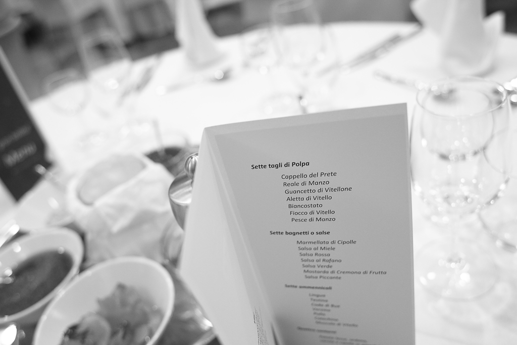 Come da Accademia, la serata ha visto protagonisti sette tagli di Polpa, Sette Ammennicoli, Sette Bagnetti/Salse, Quattro contorni in abbinamento alle portate principali e un singolare richiamo (Lonza di Maiale arrostita con Pepe Aglio e Rosmarino).